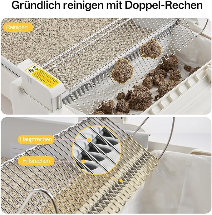 - 🐾 EFFORTLESS CLEANING & MAINTENANCE: Features a modular design for easy disassembly in just 3 steps. The metal rake and litter tray are fully removable for quick rinse-and-go cleaning. The Teflon-coated tray bottom resists scratches, prevents waste sticking, and makes every cleanup a breeze.