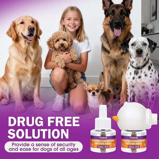 - 【Suitable for dogs of all ages and breed】The natural pheromones produced by the dog calming diffuser are suitable for most breeds of dogs, giving your dog comfort you can trust. This pheromone diffuser is veterinarian-endorsed and 100% drug-free, offering a safe and natural alternative to anxiety wraps or sedatives. From energetic puppies to sensitive senior dogs, it’s a gentle solution for everyday stress relief.