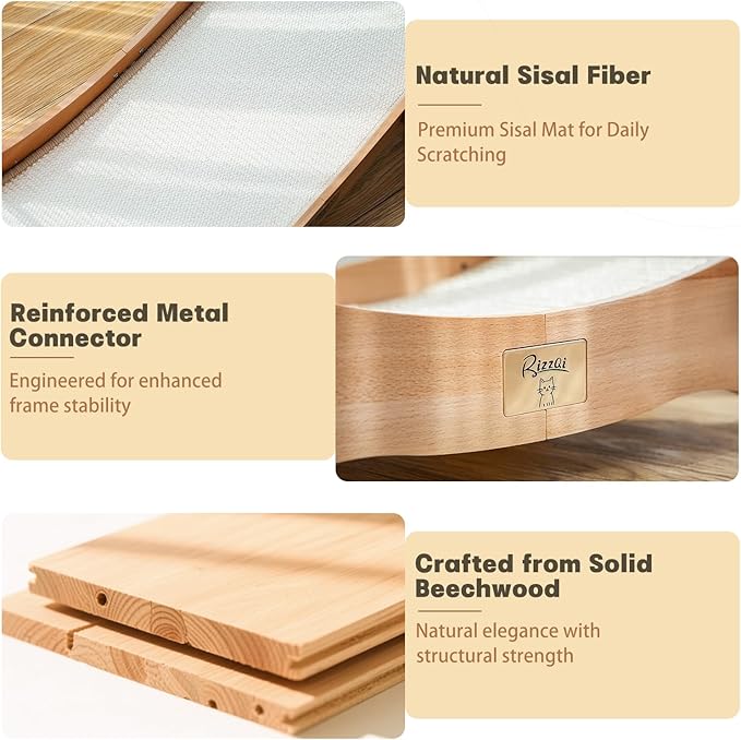 - 【Easy to Assemble】 - The RizzQi cat scratcher bed is easy to assemble in just minutes—no tools required. Each wooden piece fits securely with metal connectors, and a clear illustrated manual is included for quick setup. Measuring 26.77"L × 12.59"W × 9.4"H, it’s spacious for large or multiple cats.