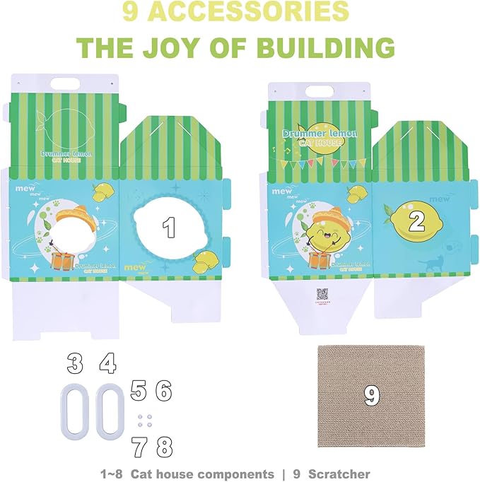 - 2-IN-1 CAT HOUSE & SCRATCHER: This lemon milk carton–themed cardboard cat house is both a fun hideaway and a durable scratching pad. It gives your cat a cozy space to rest while encouraging healthy scratching behavior that helps protect your furniture