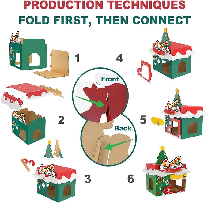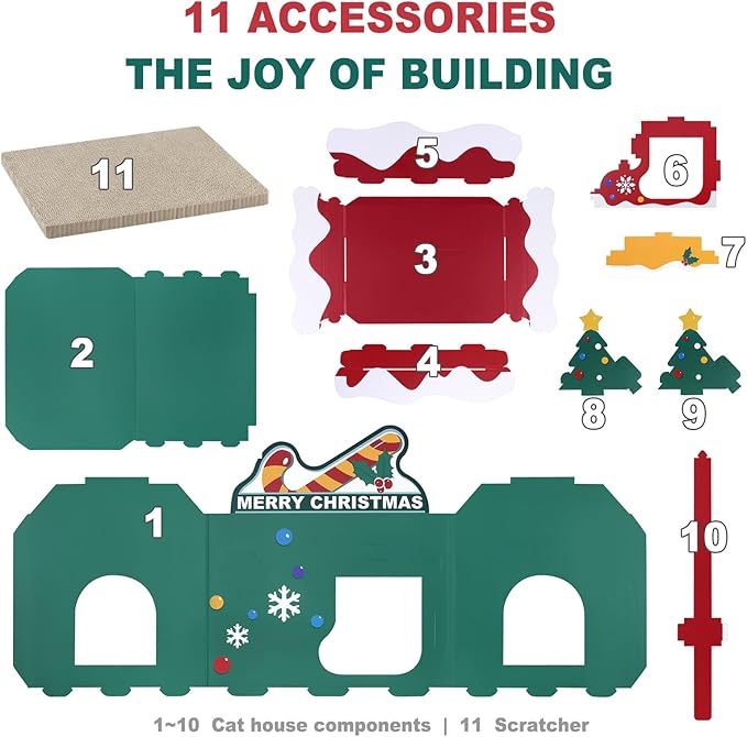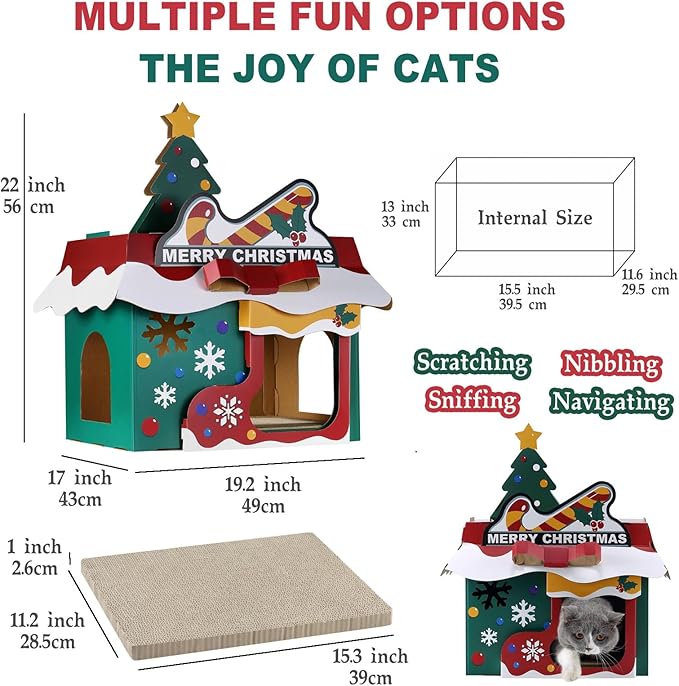 - 2-IN-1 CAT HOUSE & SCRATCHER: This Christmas-themed cardboard cat house is both a festive hideaway for resting and napping and a durable scratching pad for healthy claws. It provides a cozy retreat for your cat while helping protect your furniture