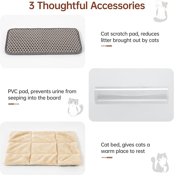 - Anti-Tracking & Moisture Protection: Equipped with a built-in scratch pad to minimize litter tracking and a high-quality PVC mat that effectively isolates urine, the hidden litter box furniture can effectively prevent moisture damage and keeping the interior clean, dry, and odor-free.