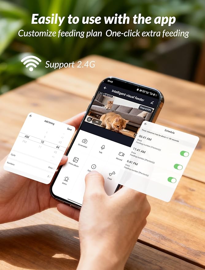 - See, Talk & Play With Your Pet: Stay connected anytime, anywhere! This smart pet feeder features a built-in 2.4G Wi-Fi camera for live video monitoring, allowing you to perfectly capture every moment your pet plays at home.You can view your pet's feeding history in the app.Even in low-light environments, the automatic night vision function ensures a clear image.