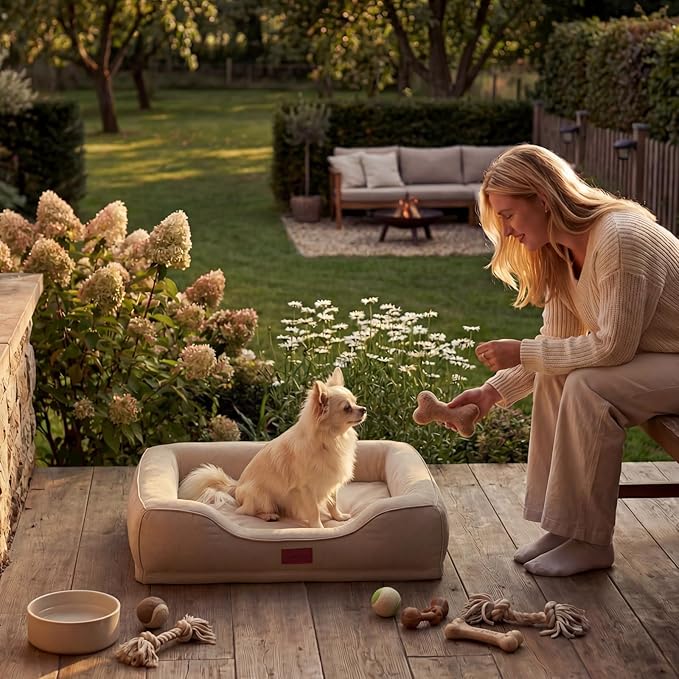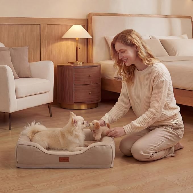 - Modern Design: small puppy bed designed in a simple and modern rectangular shape, with curved aesthetic decorations, achieving an elegant balance. The elegant beige color brings leisurely comfort, complementing most home decor.