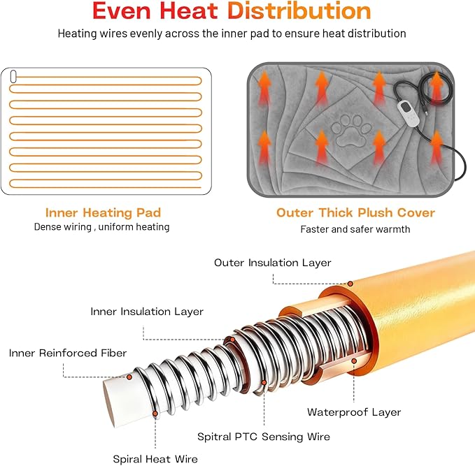 - Multi-Layer Design for Safety: The pet heating pad features a separate inner and outer design with 12 layers of protection. Crafted from waterproof, flame-retardant PVC material and and equipped with a smart temperature control unit to prevent overheating, allowing your pet enjoy warmth and comfort safely.