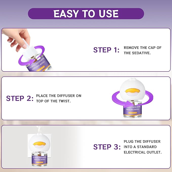 - 🏠 Wide-Area Relief A single diffuser covers areas up to 700 sq. ft., offering home-wide calming support. Designed for ultimate ease of use. Simply plug it in and let it work. The compact plug can rotate 90 degrees to fit any outlet snugly, even in tight spaces behind furniture. This plug-in design makes it a truly hassle-free relaxation solution for any busy pet owner.