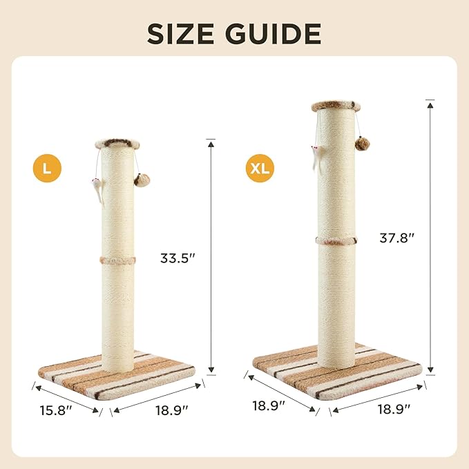 - Extra-Tall: Large scratching post often feature an extra-tall design, providing cats with an extended vertical surface to stretch and fully engage their muscles. 34inch height allows cats to indulge in their natural climbing instincts and provides them with a secure and satisfying scratching experience.
