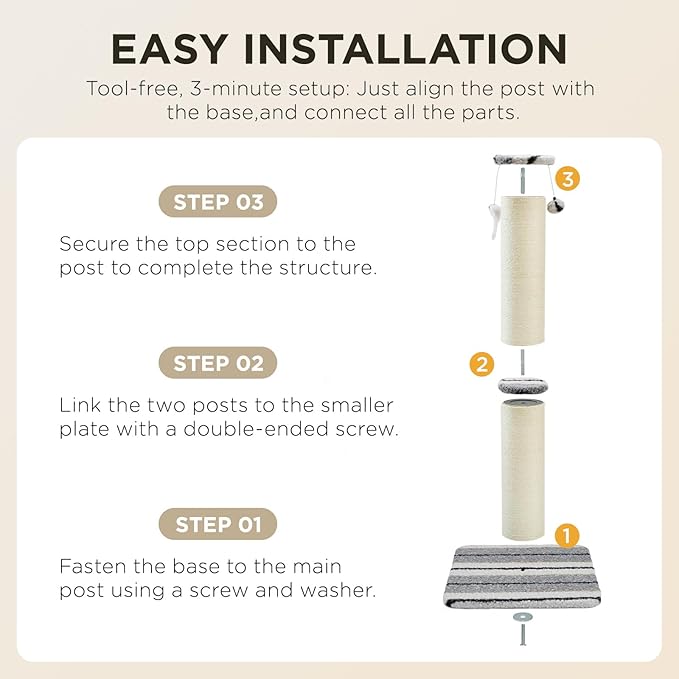 - Easy Assembly and Stability: Comes with straightforward assembly instructions and all the necessary tools included. These posts are designed to be stable and secure, even during vigorous scratching sessions and climbing. They typically feature wide and sturdy bases or can be securely anchored to the floor or wall, ensuring that the post remains stable and upright, providing a safe and enjoyable scratching experience for your cat.