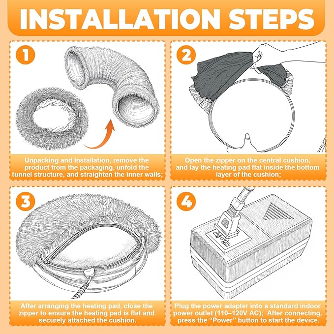 - Smart Heating & Auto Timer - This heated cat tunnel bed features a smart LED controller offering 10 adjustable temperature settings (77–131℉) and 3 auto-off timers (4H/8H/12H) to fit every season and pet preference. Whether you’re shopping for a heated cat bed indoor, heated pet mat, or cat heating bed, this model provides energy-efficient comfort with reliable safety.