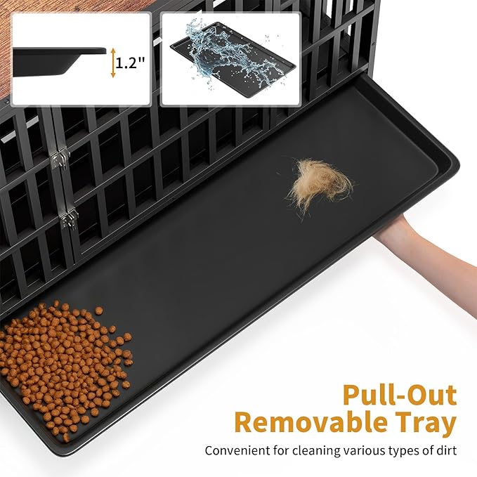 - 【Removable Tray for Easy Cleaning】: Features wide-spaced metal plate flooring that allows waste to fall directly into the slide-out tray. Helps maintain kennel furniture cleanliness, minimizes odor and mess, and ensures a healthier space for your dog—no more daily heavy scrubbing.
