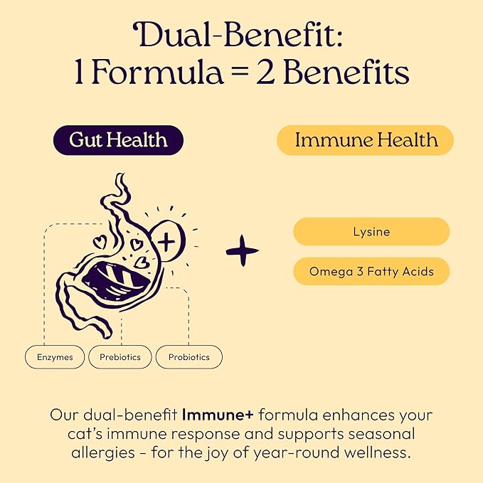 - Immune+ Cat Treat: This treat supports a healthy respiratory system thanks to Lysine. Immune+ Treats, with GutBoost in every bite, support healthy immune defenses by adding Omega-3 Fatty Acids, too.