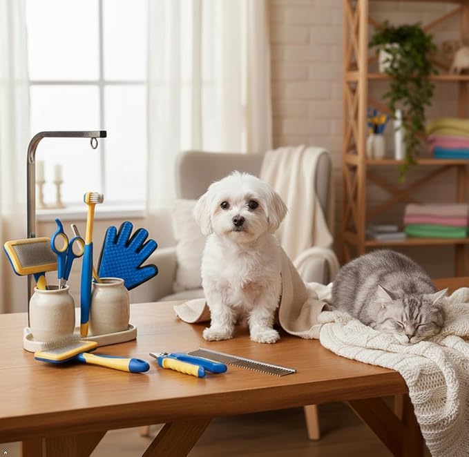- Complete 8-in-1 Pet Grooming Kit: Includes deshedding brush, nail clippers, scissors, comb, nail file, pet toothbrush, grooming glove, and a collapsible travel bowl – everything you need for home grooming