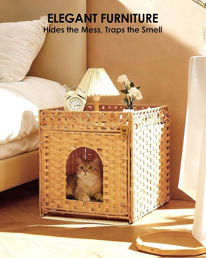 - 【Pet-Friendly & Breathable Enclosure】Provide a private retreat for your pet with this cat litter enclosure. Made from natural rattan, this hidden litter box ensures a well-ventilated and comfortable environment, creating a safe and inviting space for your cat.