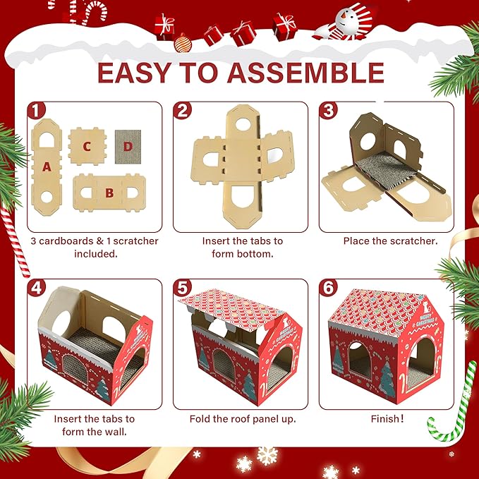 - 【Easy to Install】Just three easy-to-assemble cat house cardboard components, you can easily create a cozy Christmas cat playhouse in just minutes—no adhesive or extra tools needed! We also provide an assembly videos to help you complete it.