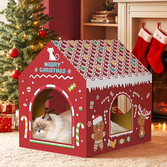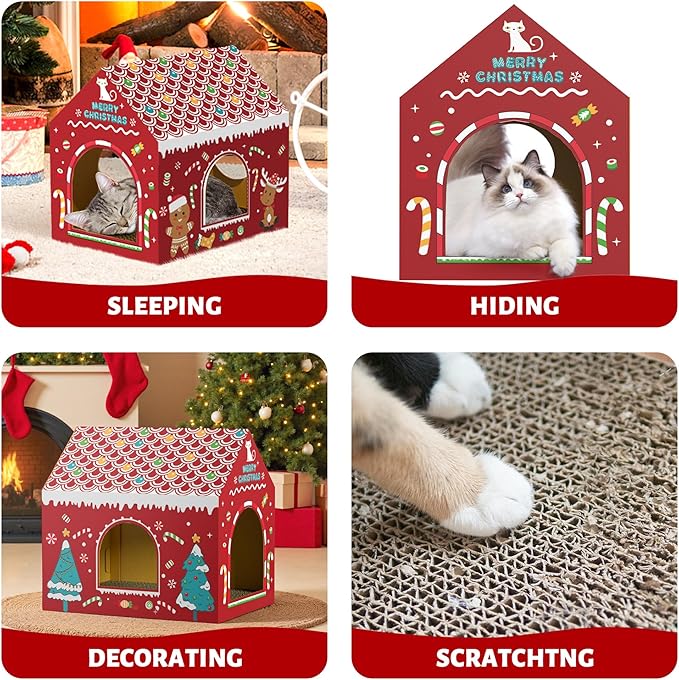 - 【Great Christmas Gift】Our cardboard cat house for indoor cats is adorned with Santa Claus and deer pattern, which is suitable for use in winter, providing a cozy resting space for your furry friends. So our cardboard cat scratcher house is a perfect gift for your cat's birthday or for any cat enthusiast in your circle this Christmas season!