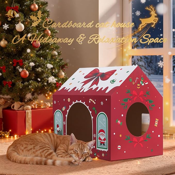- 【Great Christmas Gift】Our cardboard cat house for indoor cats is adorned with cute bows, which is suitable for use in winter, providing a cozy resting space for your furry friends. So our cardboard cat scratcher house is a perfect gift for your cat's birthday or for any cat enthusiast in your circle this Christmas season!