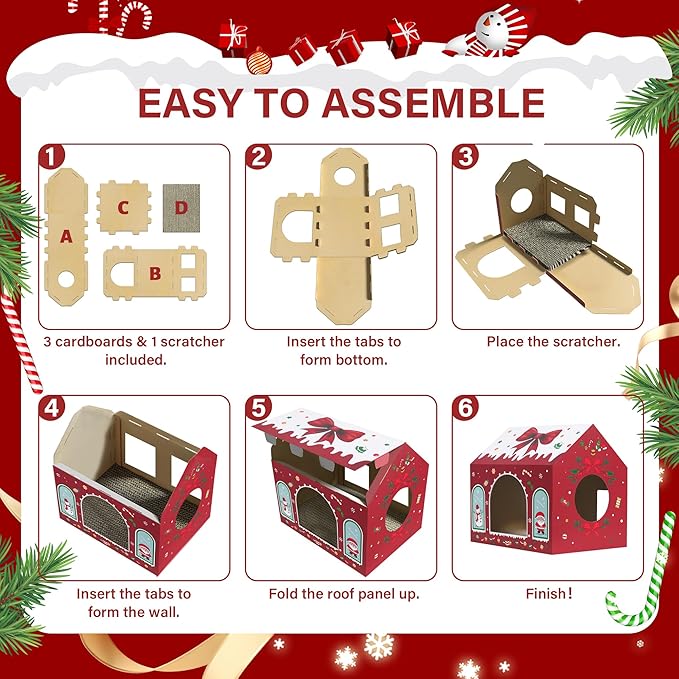 - 【Easy to Install】Just three easy-to-assemble cat house cardboard components, you can easily create a cozy Christmas cat playhouse in just minutes—no adhesive or extra tools needed! We also provide an assembly videos to help you complete it.