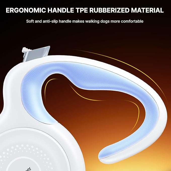 - Comfortable Anti-Slip Grip & Tangle-Free Design The ergonomic handle is crafted from soft TPE material for a secure and comfortable one-handed grip. Thanks to the unique U-shaped exit guide, the leash rotates 360° freely, reducing tangles and providing a smoother walking experience.