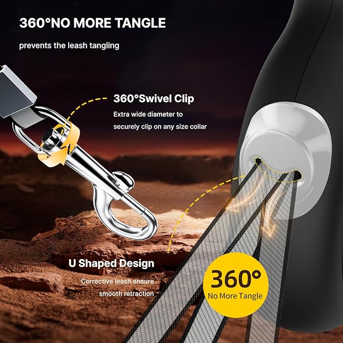 - Auto-Brake Safety System & Smooth Retraction Equipped with an innovative automatic brake mechanism, the leash instantly locks when your dog pulls or sprints unexpectedly. The built-in shock absorption helps prevent injuries—working like a car seatbelt for your pet. A high-quality stainless steel spring ensures fast and smooth rewinding.