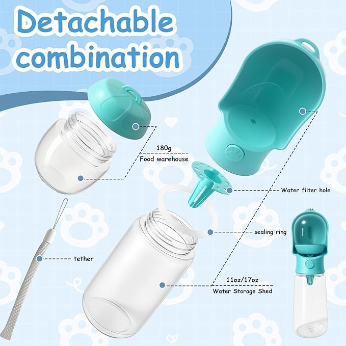 11OZ Portable Dog Water Bottle with Food Container | BPA-Free | Leak-Proof | Perfect for Outdoor Walks (Blue, 11OZ)