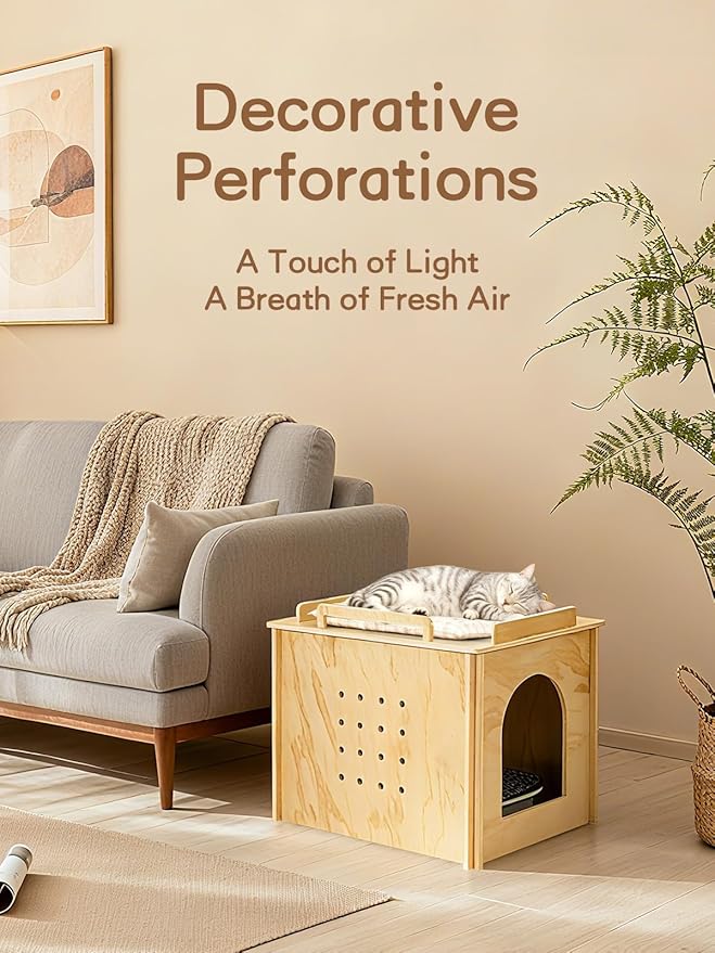 - Stylish and Multi-Functional: With its minimalist wooden look and multiple color options, this hidden litter box enclosure complements modern, farmhouse, rustic, or boho interiors. It can serve as a hidden litter box, a cozy cat house, or a stylish side table for plants and decor