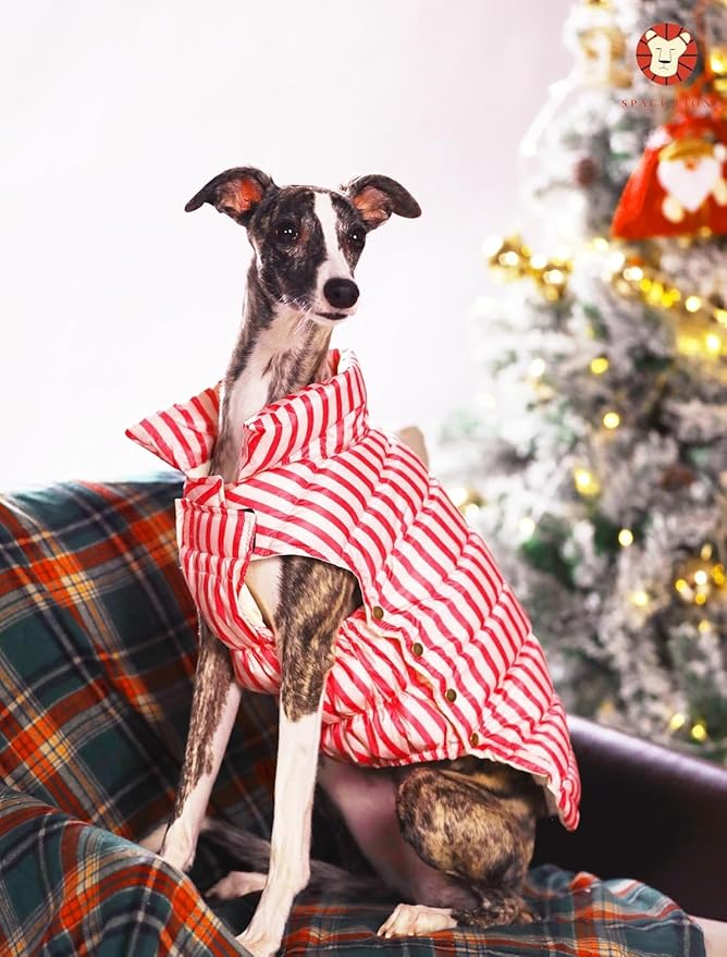 SPACE LION Dog Puffer Jacket, Down Winter Coat, Durable Outdoor Coat for Cold and Windy Conditions, Lightweight & Adjustable Fit Coats for Large Dogs, (RedStripe, Size26/3XL)