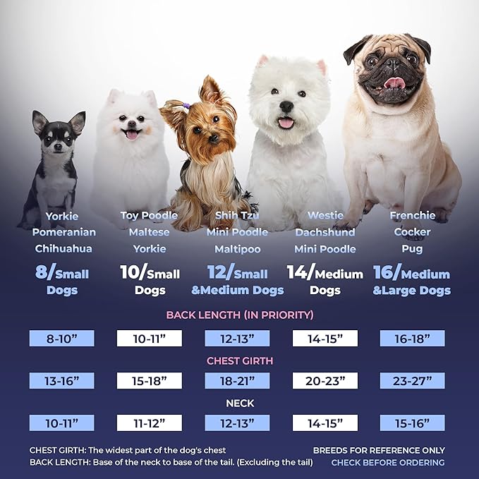 - 【INCLUSIVE SIZE RANGE】Back length includes: 8", 10", 12", 14", 16", 18", 20", 22", 24", 26", 28", 30". This dog down jacket offers a complete size selection ensures every dog finds its perfect fit. It accommodates most breeds, including popular small breeds such as Yorkies, Pomeranian, Poodles, Malteses, and Dachshunds. For accuracy, we recommend measuring your puppy's size and referring to the size chart to ensure the most comfortable fit.