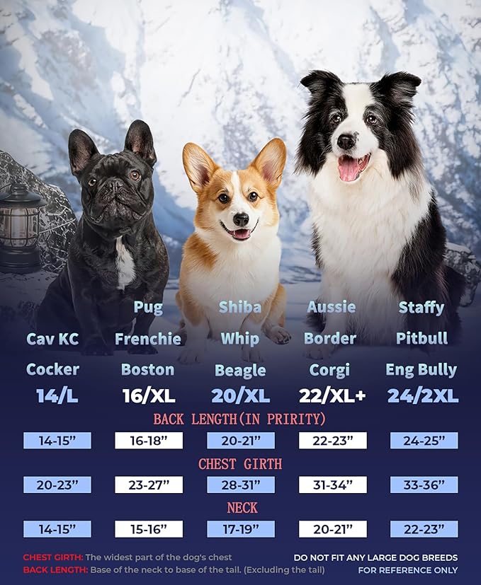 - 【INCLUSIVE SIZE RANGE】Back length includes: 8", 10", 12", 14", 16", 18", 20", 22", 24", 26", 28", 30". This dog down jacket offers a complete size selection ensures every dog finds its perfect fit. It accommodates most breeds, including popular medium breeds such as French Bulldog, Beagle, Corgi, Pug, and Border Collie. For accuracy, we recommend measuring your puppy's size and referring to the size chart to ensure the most comfortable fit.