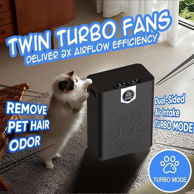 - 【TWO-SIDED AIR INTAKE UP TO 3000 FT²】Our air purifier stands out with its innovative dual-sided air intake system, providing faster air circulation and purifying up to 3,000 sq. ft. per hour in turbo mode. Featuring two H14 HEPA filters, this air purifiers for home large room offer significantly cleaning performance. Whether you're relaxing in the bedroom, entertaining in the living room, cooking in the kitchen, or working in the office, you can immediately experience fresher, cleaner air