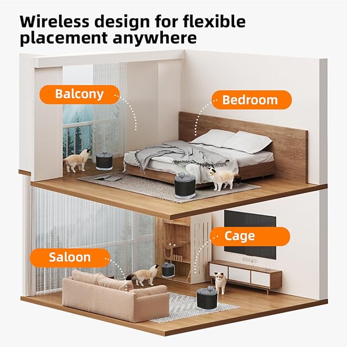 - Cordless Battery Operated Design: Cordless water fountain design allows your cats enjoy fresh water freely anywhere. As cats love randomly running from room to room, the drinking fountain should not being set up in a fixing place. External wires were eliminated to prevent your furkids chewing them