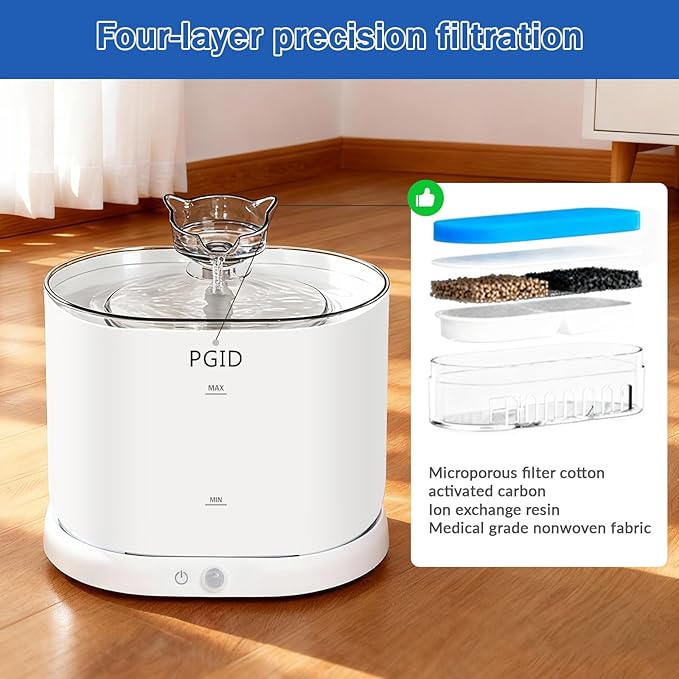 - Plastic Water Tank & Multi filter System: FGID battery operated dog water fountain is made with durable and high quality plastic water tank, (the filter holder and water tank is plastic) which is safe and hygienic for pets to drink from, protecting your furry friends from getting feline acne, also making it easy to clean and maintain. The drinking fountain maintains pure water with a 5-layer circulating filtration system, ensuring every sip is fresh and clean