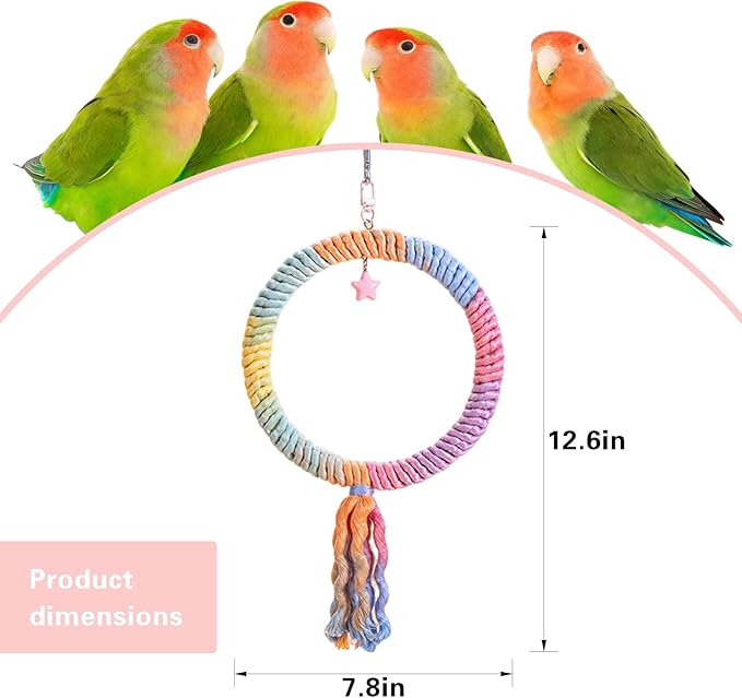 - Size: The bird swings for parakeets is 7.9 inch, the inner diameter is 6.3 inch. It fits for Parrots, Budgies, Parakeets, Sun Conures, Cockatiels, Lovebirds, Finches, Canary and most similar size birds.