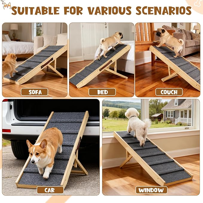 - 5 Adjustable Height for Perfect Fit to Furniture: The pet ramp with 5 adjustable height settings(12.6", 15", 16.5", 18.5'' and 19.5''), you can easily customize the ramp's incline to perfectly match your bed, sofa, or car. The gentle slope is ideal for small dogs, making it easy and comfortable for them to climb up and down without jumping, which is especially beneficial for puppies, senior pets, or those with short legs.