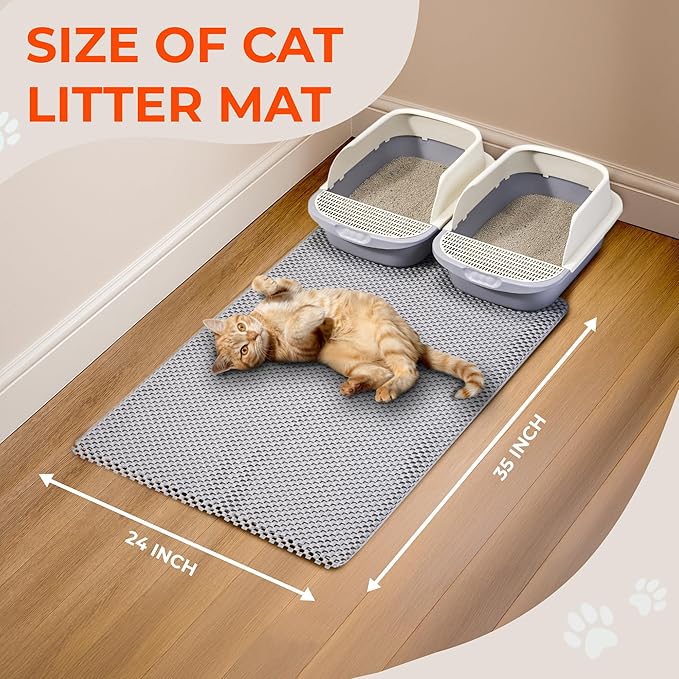 - Soft & Gentle on Paws: Our cat litter mat is made from premium PVC foam material, which is softer than EVA. This means fewer creases and a plush experience for your kitty’s sensitive paws. Your feline friend will love to scratch and lounge on it! This 35x24inch size litter mat is large enough to accommodate 1-2 litter boxes