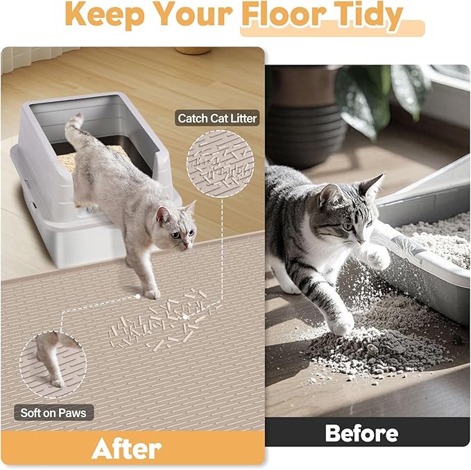 - Wide Use: Place this large litter mat under your cat litter box to contain the mess, or use it as a feeding station to keep your kitchen floor spotless. It's the perfect litter box mat for cats, dogs, and other pets. Its neutral color and sleek design blend seamlessly with any home decor.
