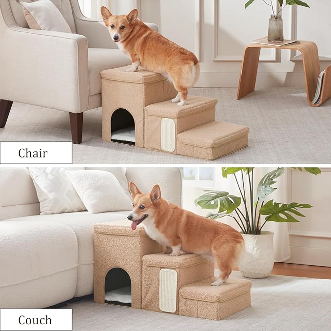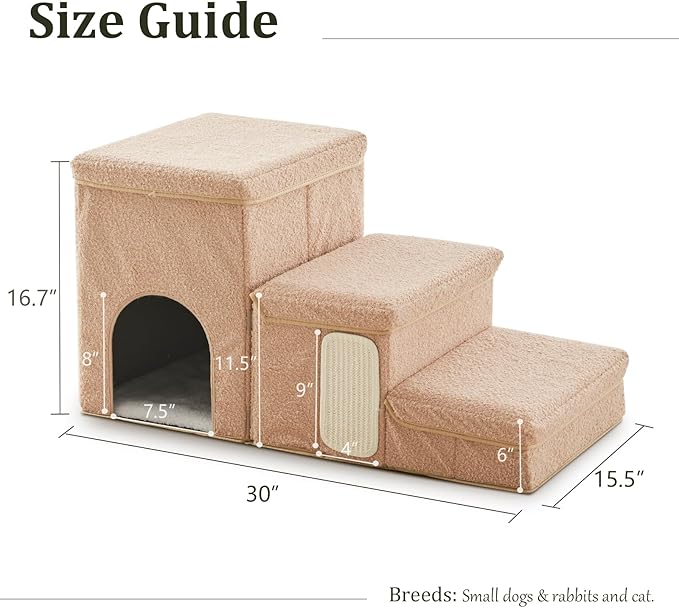 Dog Stairs with Storage and Condo,Cat Scratcher, 3-Step Sturdy Dog Steps for Small Medium or Large Older Dogs Cats, Folding Pet Stairs Climbing Sofas, high beds, Windows and Cars (Beige,16.7'' H)