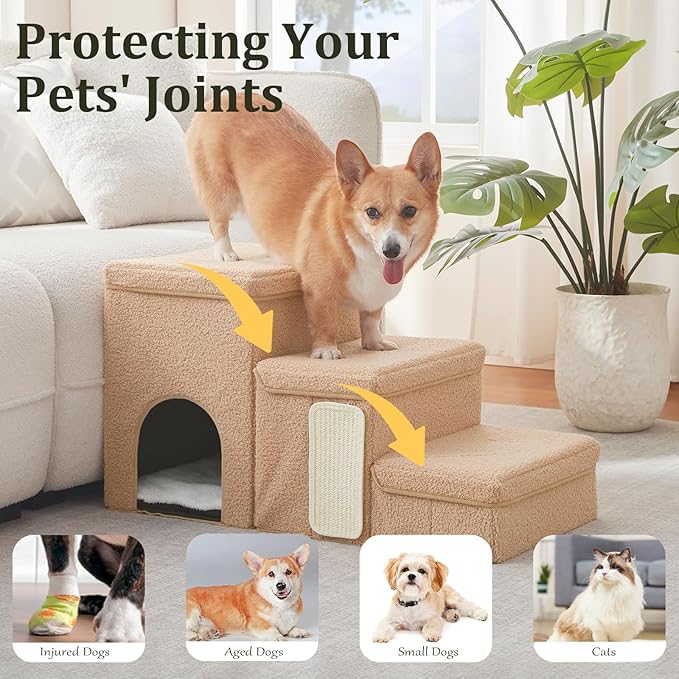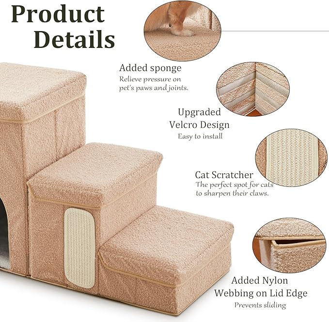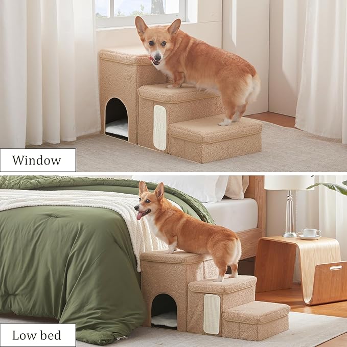 - 3-IN-1 PET STAIRS WITH STORAGE, CONDO AND Cat Scratcher: The versatile pet stairs not only provide a stable and comfortable step for your pet, but also feature a spacious storage area perfect for storing pet clothes, toys, or other essentials. Additionally, it is a cat condo with a soft plush mattress for cat a cozy sleeping spot. This pet stairs design is ideal for households with cats and dogs, catering to all your needs.