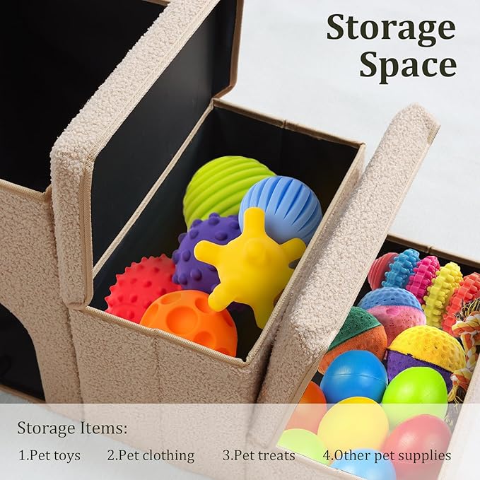 - 2-IN-1 PET STAIRS WITH STORAGE, CONDO: The versatile pet stairs not only provide a stable and comfortable step for your pet, but also feature a spacious storage area perfect for storing pet clothes, toys, or other essentials. Additionally, it is a cat condo with a soft plush mattress for cat a cozy sleeping spot. This pet stairs design is ideal for households with cats and dogs, catering to all your needs.
