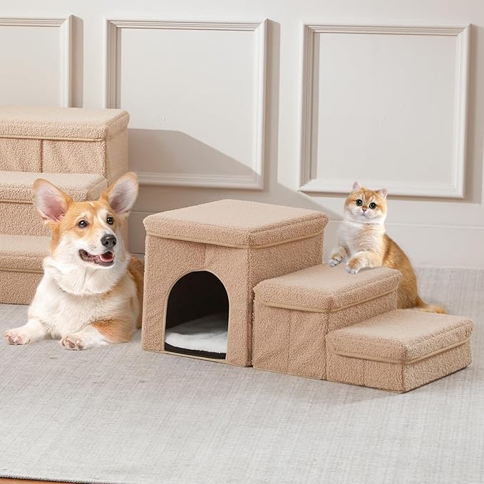 Dog Stairs for Small Dogs with Storage and Condo,Foldable Pet Stairs for Small Medium or Puppy Dogs and Older Cats, Dog Steps for Bed or Couch(Beige,13" H)