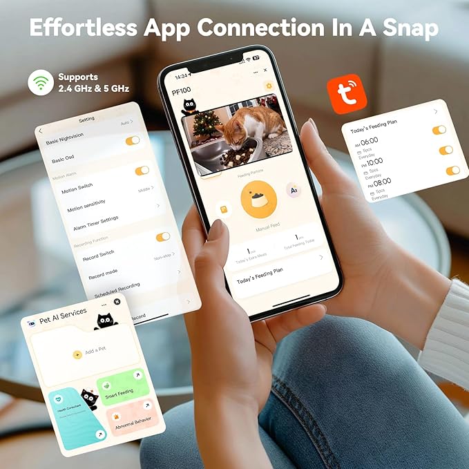 - 【Stable Dual-Band WiFi】Supports both 2.4G and 5G WiFi for fast, stable connections, even in complex network environments. Wherever you are, you can feed, view real-time video, or adjust camera angles remotely through the app. Smart pet care made easy