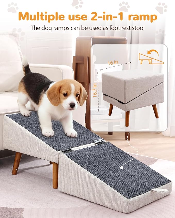 - Foldable Design: This dog ramp is one-of-a-kind. When fully extended, it’s a dog stair with 31.5" L × 13.5" H—perfect for helping your dog climb onto the sofa. When folded, it turns into a super handy little stool, measuring 16.7" ×16". This pet step is designed to meet your dog’s needs for easy couch access while also doubling as footrest, or shoe bench. It’s a versatile 2-in-1 solution that brings added convenience and fun to your home
