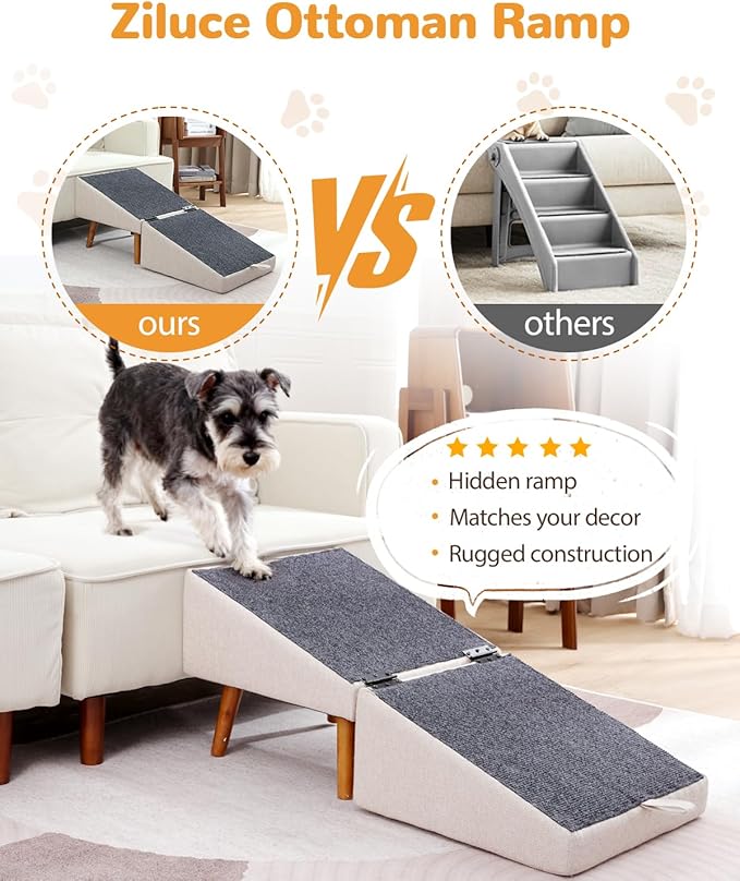 - Stylish and Easy to install: The dog ramp has a split ottoman design and crafted with solid wood and high-quality materials, it blends nicely with your home decor. Minimal assembly required - Just fix the legs and provide your pet with a safe way to jump onto the bed or couch