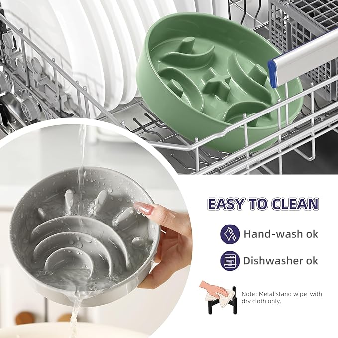 - Quick Clean, Heat Safe – These ceramic slow feeder both microwave- and dishwasher-safe, its smooth surface makes cleaning effortless .If using wet food, rinse within 10 minutes, a little water helps loosen leftovers for easy clean-up.For the stainless steel stand, simply wipe it with a dry cloth.