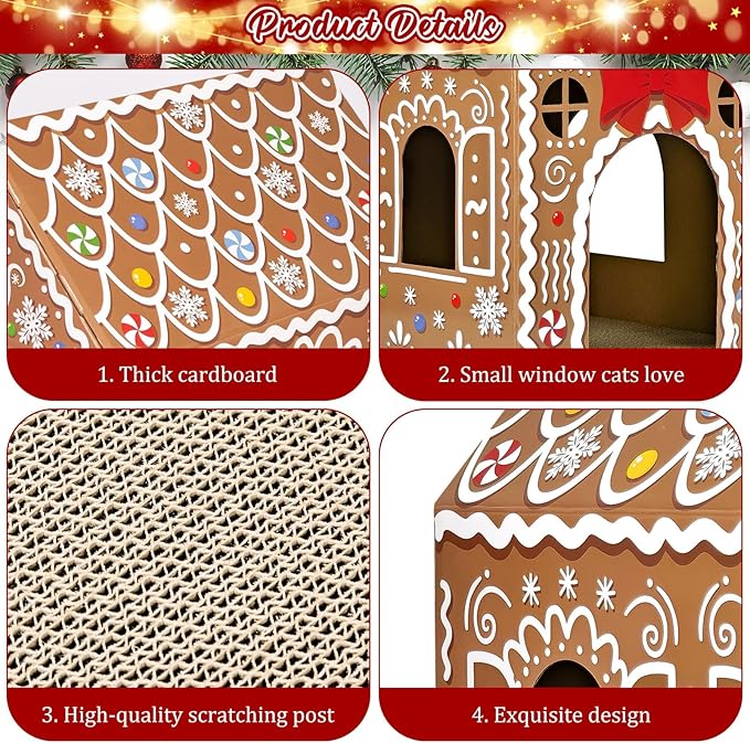 - Christmas Cardboard Cat House: Treat your furry friend to festive fun with this Christmas cardboard cat house with scratcher! Featuring gingerbread and snowman designs, this pet playhouse hideaway condo adds holiday charm to your Xmas décor, entertaining indoor cats, kittens, rabbits, or bunnies.
