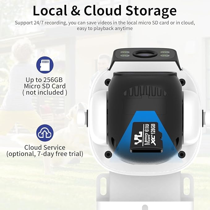 - Two-Way Talk &Local/Cloud Storage: The plug-in surveillance camera has a built-in microphone and speaker that supports real-time two-way talk, you can communicate directly with your family or visitors,Outdoor cameras for home security supports cloud or local SD card storage(up to 256GB,not included).Besides,360° camera outdoor support 2.4GHz WiFi(not support 5Ghz)