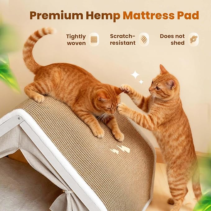 - DESIGN FEATURES: Premium rattan-style exterior with natural sisal cat scratcher mat and solid wood frame cat house with curtains and cat floor scratching pad rug, protect your couch and carpets, creating a cozy and private retreat for your pet