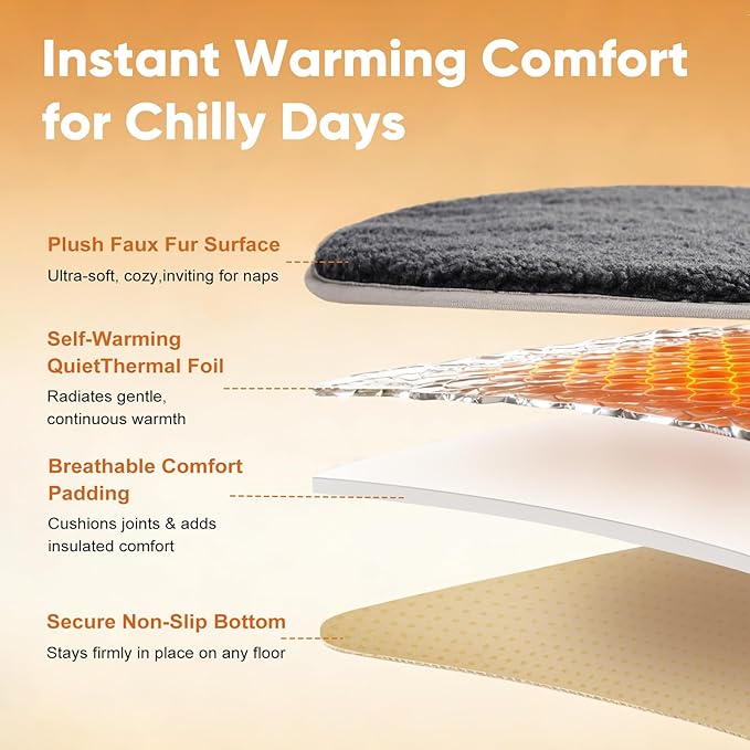 - Thickened Cushion for Cloud-Like Rest: Featuring a full 0.4-inch thickened cushion, this upgraded self heating cat pad offers plush softness and joint-friendly support. Its insulated design helps maintain warmth, giving pets a soothing lounging experience similar to a premium warming mat for cats