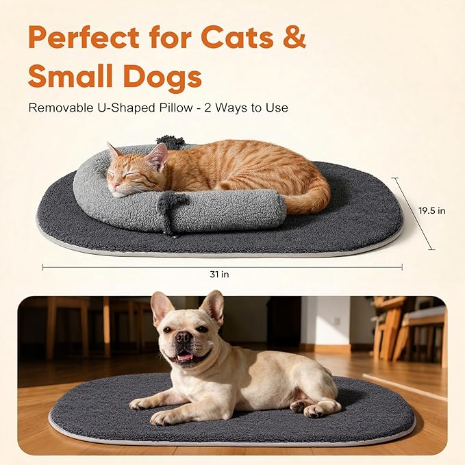 - Calming U-Shaped Pillow for Added Security: The detachable U-shaped pillow adds comfort and stability, making this cat warming mat feel like a secure, enclosed resting space. Ideal for anxious or senior pets, it works like a gentle self heating cat bed, offering neck support and a warm, calming environment throughout colder nights
