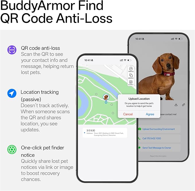 - BuddyArmor Find QR Code Anti-Lost System – Integrated BuddyArmor Find QR tag which is made of U.S. food-grade silicone lets anyone scan to access your pet’s information instantly and upload location, helps reunite lost pets with their owners quickly.