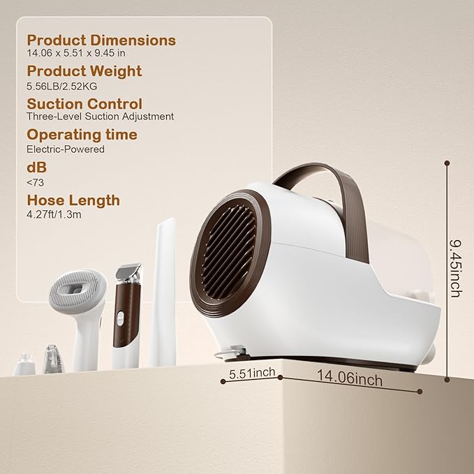 - 🐈Flexible Use & Easy Storage: The hose extends to 4.27 ft and the power cable reaches 8.2 ft, offering ample length for flexible grooming in your yard or large living room without distance limitations. This setup helps keep your pet far away from motor noise, making it more suitable for sensitive or larger pets. Keeping your space clutter-free while offering a complete dog grooming vacuum solution.